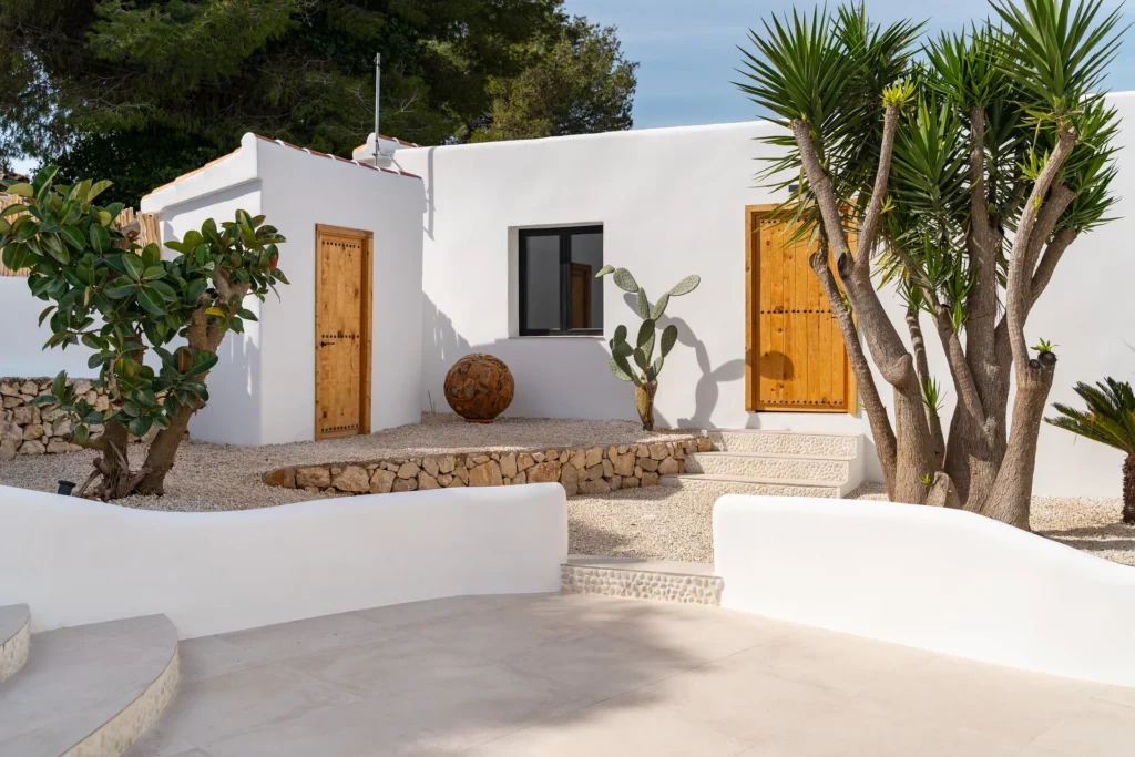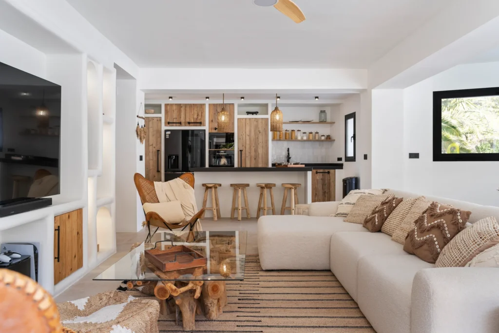 Villa Querida refleja el ambiente relajado de Ibiza — colores claros, materiales naturales y un toque de lujo bohemio.